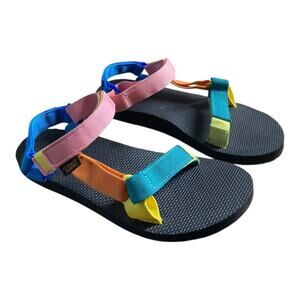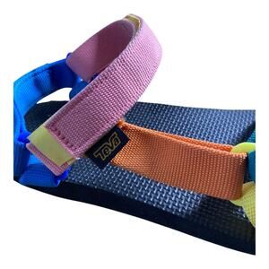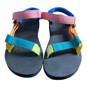 Get ready for your next adventure with these Teva Original Universal sandals! These strappy sandals feature a fun multicolor design that will add a pop of color to any outfit. They are in excellent condition and ready for a new home.