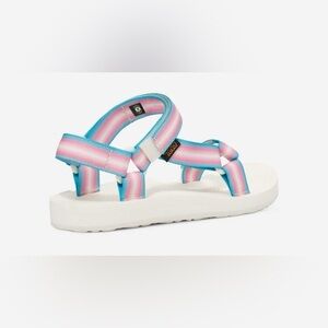 These Teva sandals boast a vibrant pink and blue color scheme, perfect for summer outings. Designed with adjustable velcro straps and a lightweight sole, they offer both comfort and style for casual walks and light outdoor activities.
