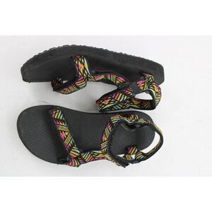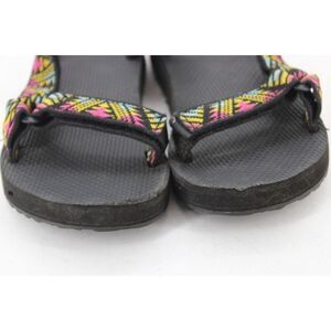 Elevate your summer style with these Teva sandals in a vibrant pink, yellow, and purple color palette. The strappy design and comfortable fit make them perfect for any occasion, from a day out with friends to a weekend camping trip. These sandals are a must-have for any fashion-forward woman's wardrobe.