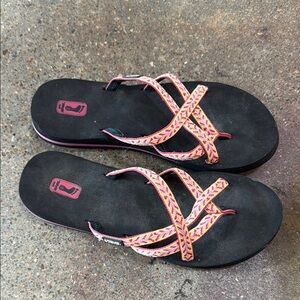 Stylish Teva sandals with black soles and pink patterned straps. Ideal for everyday comfort.