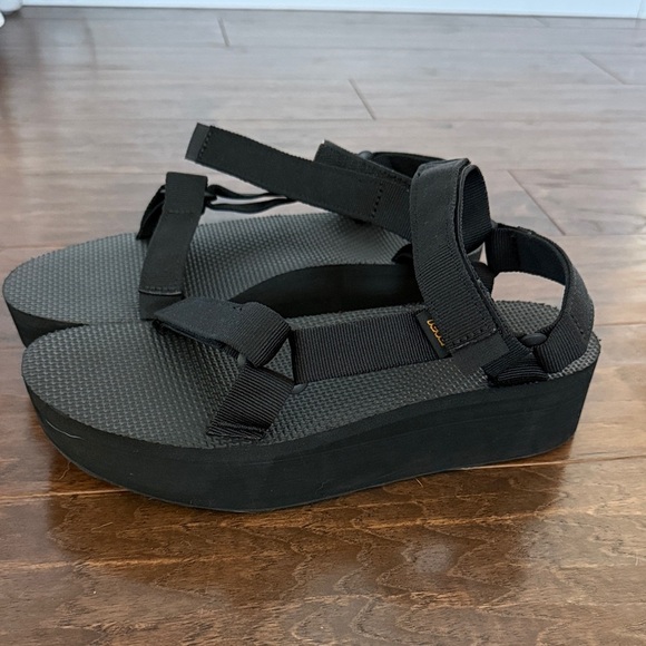 Elevate your style with these chic black platform sandals. Perfect for any occasion, these sandals offer both comfort and fashion. Worn once.