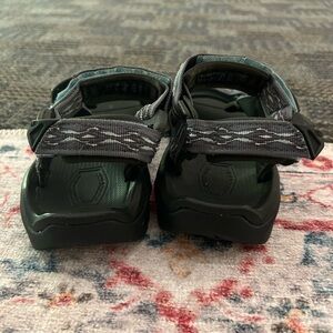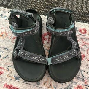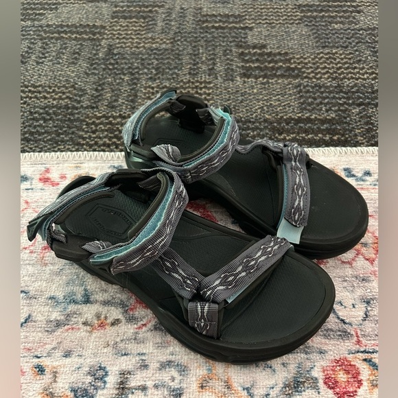 EUC pair of Terra Fi hiking sandals from Teva in a size 7. These sandals are rugged and heavy duty with a sturdy sole. Blue patterned straps. No stains or flaws!