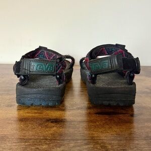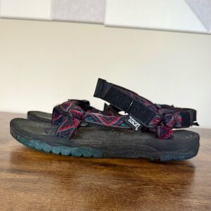 Men’s Teva Terradactyl sport sandals in size 12, designed for comfort, durability, and grip. These sandals feature adjustable hook-and-loop straps with a black, red, and teal geometric webbing pattern. The rugged rubber outsoles offer excellent traction for outdoor adventures, and the cushioned footbed provides lasting comfort.