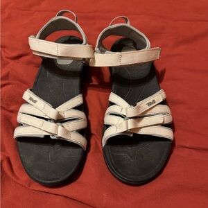 Teva Tirra Sandals women’s size 10. Features a polyester webbing upper, Velcro closure, neoprene back straps, and contoured midsoles.