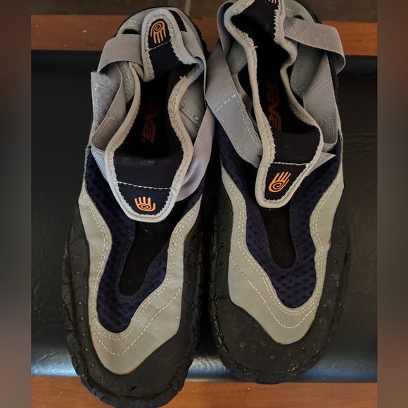 Secure hook-and-loop straps for an adjustable fit. Mesh upper panels for breathability. Rubber lug soles for wet traction. Contrasting orange logo accents. Ideal for water and outdoor use.