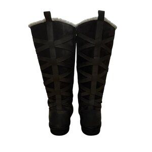 Waterproof leather construction with warm insulated lining. Features a stylish crisscross back detail and durable sole for winter weather conditions. Made for comfort and function.