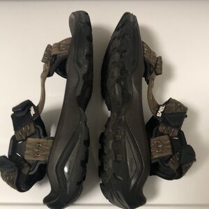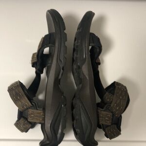 EUC Teva sandals in a dark brown with black bottoms and design on straps. Velcro on whole ankle for fit on front and back as well as Velcro in front for adjusting strap. Design of lighter browns as shown. Shock pad on bottoms.