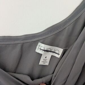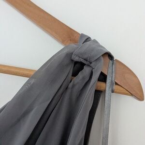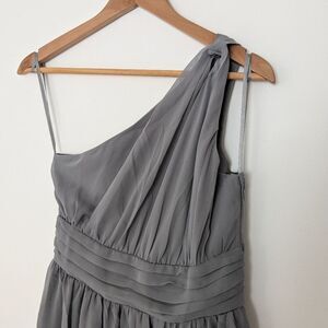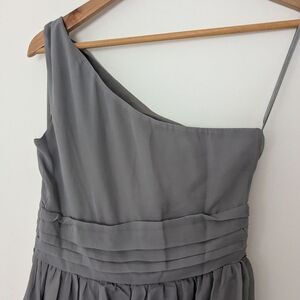 flowy shape, grey color, one shoulder with a twist accent, zip closure. lightweight and easy to wear for a beach wedding or anything bridesmaid!