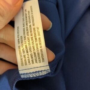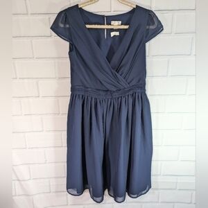 Super flattering lightweight faux wrap navy dress with keyhole back neck closure and ruching around the waist by Tevolio.