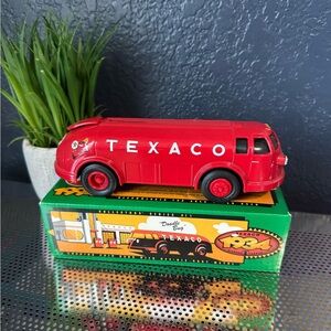 Vintage Texaco Diamond T Tanker (Doodle Bug) coin bank from 1934. Collector’s Series #11. Bright red die-cast tanker with original Texaco branding. Includes box.