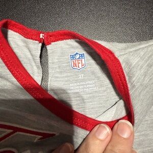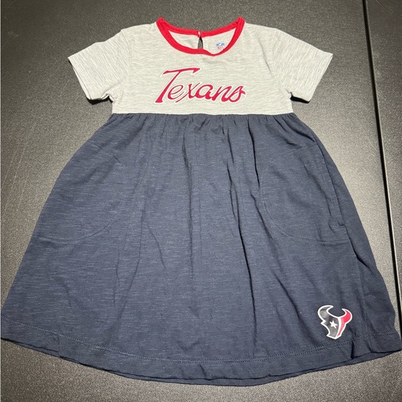 Adorable Texans dress featuring a logo and pockets. Gray and navy with red accents. 120