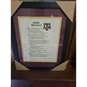 Texas A & M Aggie Graduate and Aggie War Hymn Framed 2 Pictures Black/Wood Frame. Both in excellent condition. Matted in Aggie Maroon. Both are approximately 12" x 15". Gig 'Em!!!