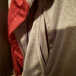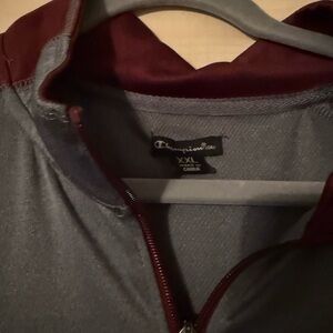 Champion pullover with gray body and maroon collar. Features a quarter-zip and logo detail.