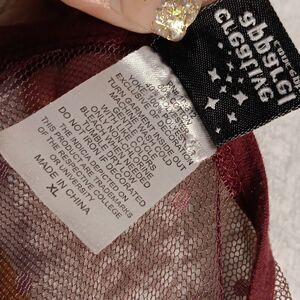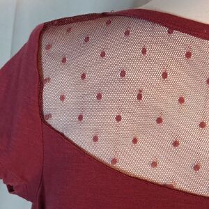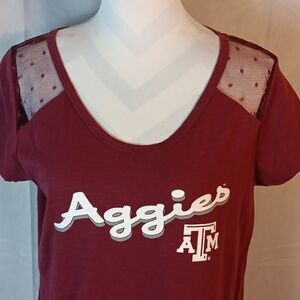 Stylish maroon t-shirt featuring 'Aggies' text. Mesh detailing on shoulders adds a trendy touch. Size XL with a pit to pit measuring 20" and a length of 26".Perfect for casual wear.