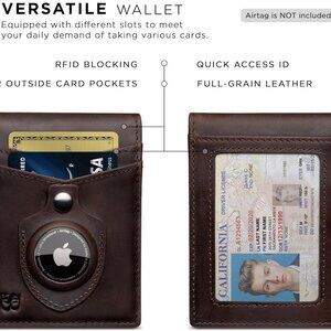 Features: Crafted from full grain leather, this slim minimalist wallet features 11 card slots, an integrated stainless steel money clip for bills, and a built-in secure snap pocket for your Apple AirTag. RFID blocking technology keeps your private info safe from scans. Perfect for the modern man who wants a streamlined look without sacrificing functionality.