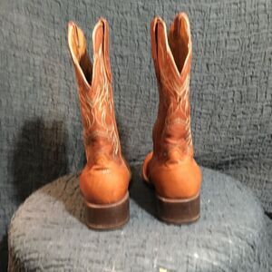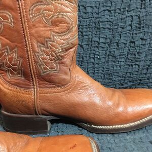Brick color/Cognac Leather Men's western cowboy boots. Light tan color embroidered design details. Pre-owned in good condition .Please refer to pictures for best description and condition verification. Size 9.5