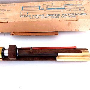 Texas INERTIA Nutcracker Vintage item made in USA. This Nutcracker allows you yo easily Cracks a variety of nuts like pecans,Brazilian nuts, pitaschos, and other hard shelled nuts. Made of wood and metal that uses an inertial force to crack nuts.