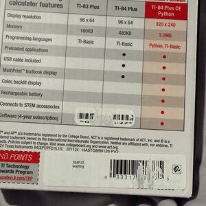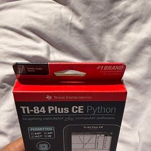 Boxed Texas Instruments TI-84 Plus CE Python graphing calculator shown. Black housing with red branding accents and a color display. Full keypad visible with numeric and function keys.