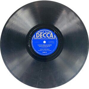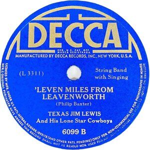 Step into the golden age of American music with this iconic 78 RPM record from Decca Records. Featuring Texas Jim Lewis and His Lone Star Cowboys, this classic recording offers two timeless songs. Side A features "Too Late To Worry, Too Blue To Cry," written by Al Dexter, while Side B boasts "'Leven Miles From Leavenworth" by Philip Baxter.