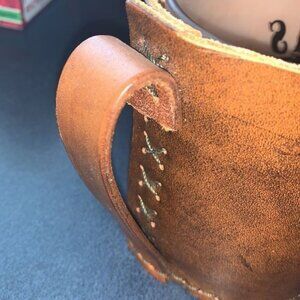 This Texas-themed frosted glass is paired with a rugged leather holder adorned with a unique emblem and personalized name. The glass, designed with a homage to the Lone Star State, offers a touch of rustic elegance. Handmade and handwash only, it complements any collection with a touch of Texan charm.