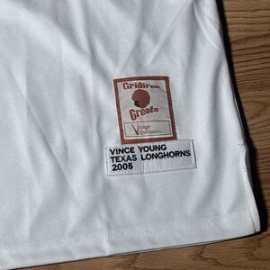 The product is a Texas Longhorns football jersey featuring Vince Young, a notable player in college football history. This officially licensed Gridiron Greats jersey in size 54 is designed for men and showcases the team's iconic colors of white. Perfect for any fan of the Texas Longhorns or football enthusiasts, this jersey is a must-have for those looking to show their team pride on game day.