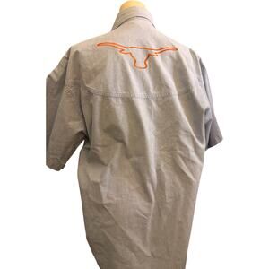 Texas Longhorns NCAA Men's Short Sleeve Chambray Button Down Shirt, Size XL. Show your Texas pride in this short sleeve button up chambray shirt featuring multiple embroidered burnt orange Longhorn logos. Crafted in a utility style design with panel stitching, this shirt is perfect for game day, tailgating or casual wear. Excellent condition.