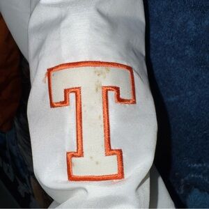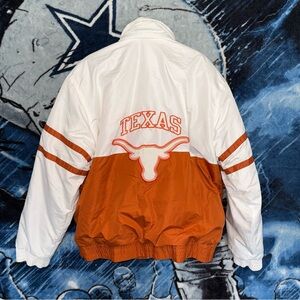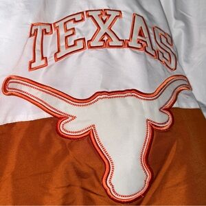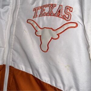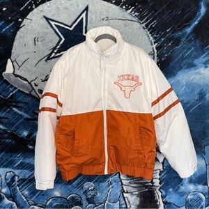Stylish Texas Longhorns jacket in white and orange. Features logo and stripes.