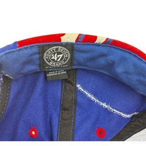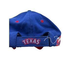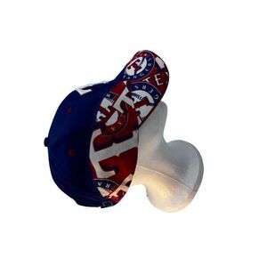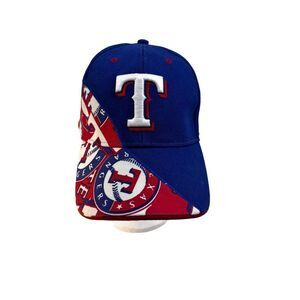 Blue adjustable baseball cap featuring the Texas Rangers logo embroidered in white with red outline on the front. The brim and side panels have a red, white, and blue patchwork-style design with additional Rangers logos. The back has an adjustable strap with “TEXAS” embroidered in red and white.