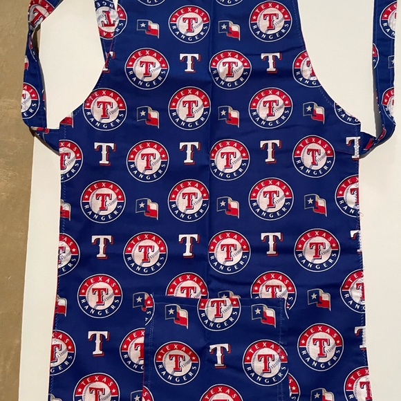 New, handmade, machine washable child’s Texas Rangers apron size medium 10-12 with adjustable neck strap. Lined.