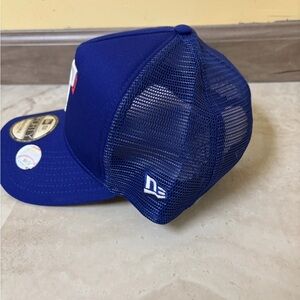 The product is a New Era 9Forty Adjustable SnapBack A-Frame Texas Rangers Trucker Hat, featuring the team's colors and logo. This Major League Baseball cap is designed for fans of the Texas Rangers, with a blue color scheme and one size that fits most. The adjustable snapback allows for a comfortable and personalized fit, making it a stylish accessory for any baseball enthusiast.