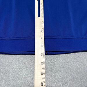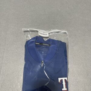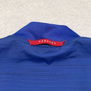This Texas Rangers MLB Jacket by Nike is a Men's size Medium, featuring the popular Dri-Fit performance fabric. The jacket is blue with an embroidered team logo and a full-zip closure, making it an ideal piece of fan apparel for showing team pride. Perfect for baseball games, light workouts, or casual wear, offering both comfort and official team style.