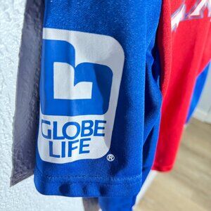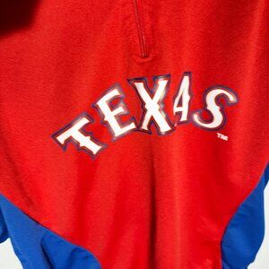 Show off your Texas Rangers pride with this official MLB quarter-zip warm-up shirt commemorating their 2015 AL West Division Championship! This authentic team-issued apparel features vibrant red and blue colors, bold "TEXAS" lettering across the chest, and detailed sponsor logos, including "Globe Life" prominently displayed on the sleeve. The opposite sleeve proudly showcases the collectible "AL West Division Champions 2015" emblem. Made from lightweight, breathable 100% polyester fabric, it offers comfort whether you're at the ballpark, training, or cheering from home. Elasticized hem and quarter-zip design provide the perfect athletic fit and easy layering. A must-have collectible for any Rangers fan or MLB enthusiast!Condition: