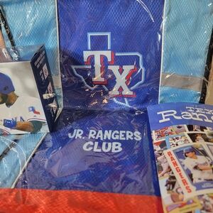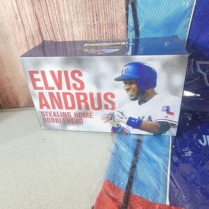 Texas Rangers Elvis Andrus bobble head, blue and red bag, and a booklet. Perfect for young fans.