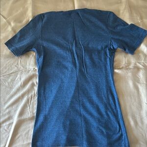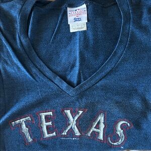Texas Rangers blue V-neck tee.