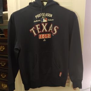 Navy blue postseason 2012 MLB Texas Rangers hoodie. NWOT but has never been worn. Majestic therma base ๐