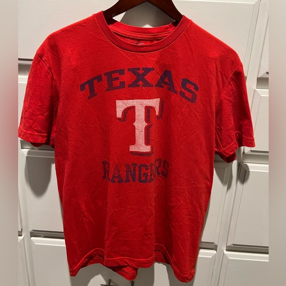 Red Texas Rangers shirt. Approx 15 years old. Good condition. Worn 10-15 times to Rabgers baseball games.