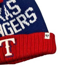 Keywords: 47 Brand, cuffed knit hat, Texas Rangers, embroidered logo, pom detail, winter hat, unisex, sports fan, team spirit, casual wear, multicolor, folded cuff, knit material, pre-owned, warm accessory.