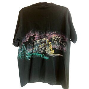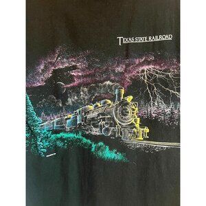 Texas State Railroad Vintage Train Graphic Black T-Shirt Made In USA Size L 90s. All aboard the nostalgia express! This Texas State Railroad T-shirt showcases a vibrant train graphic, perfect for anyone who missed their calling as a train conductor.