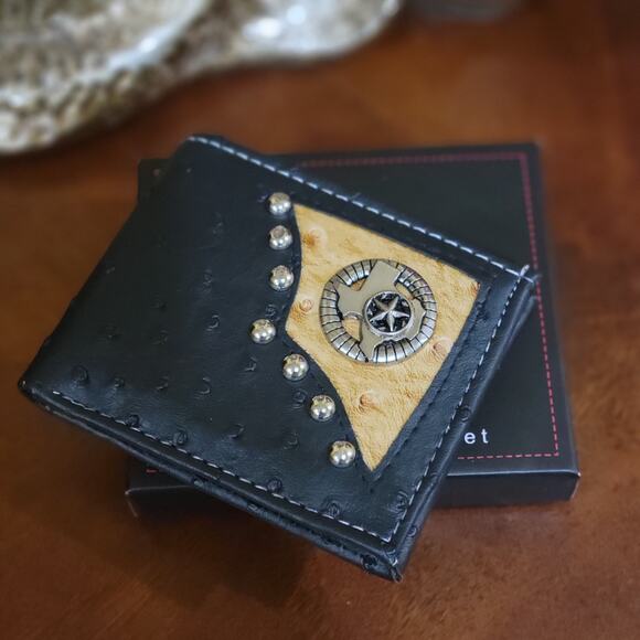 Texas concho mens Wallet Western Short Bifold Ostrich pattern black faux leather