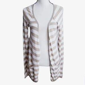 Super soft and comfortable lightweight tan and white striped cardigan, has buttons and pockets