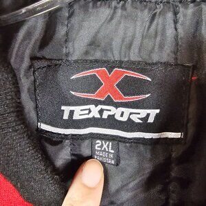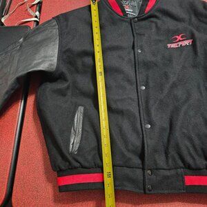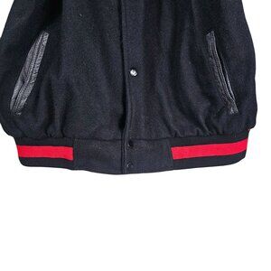 varsity jacket, black varsity jacket, leather trimmed jacket, wool blend jacket, Texport jacket, men's outerwear, 2XL jacket, snap closure jacket, red and black jacket, warm winter jacket, casual men's jacket, sporty jacket style, ribbed trim jacket, bomber jacket, motorsports, bikercore, moto, grunge, goth, punk