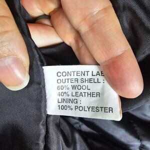 Stylish varsity jacket with leather sleeves and warm wool body, featuring snap closure and ribbed trim. Complements casual or sporty attire.