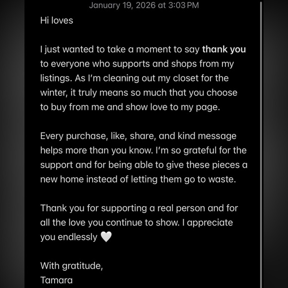 Digital thank you message expressing gratitude to customers and supporters. White text on black background.