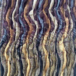This beautiful, warm scarf is perfect for Fall or Winter. It is brown, gold, beige, black and blue and very textural. It has never been worn and has no flaws. The approximate measurements are: