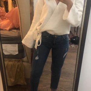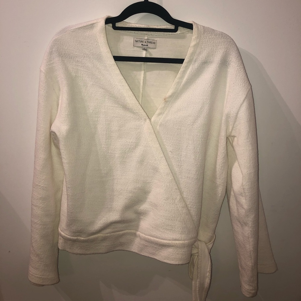 Off-white colored wrap Madewell top! I’ve worn this a couple times and there’s a tiny foundation stain that I haven’t worked hard enough in to remove but I’m sure it can be removed!! #madewell #blouse #offwhite #chic