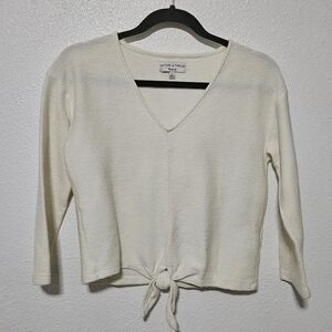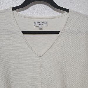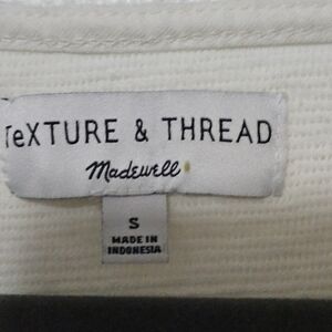 Texture and Thread Madewell textured top with tie front size small see pics for verification of size used no holes or stains measurements approximately flat lay pit to pit 17 length 17 1/2 sleeve 15 1/2