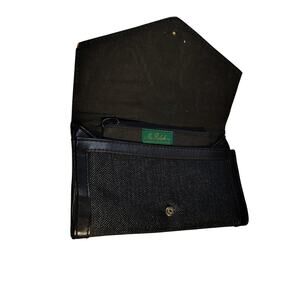 Textured Black Maxi Envelope Clutch 1970s Vintage Mr. Ralph Fold Over Snap Closure Bag. Half inch stitched faux leather edging. Zipper protected inside mini pocket. Lined in black fabric.