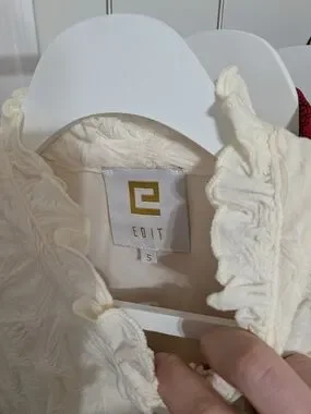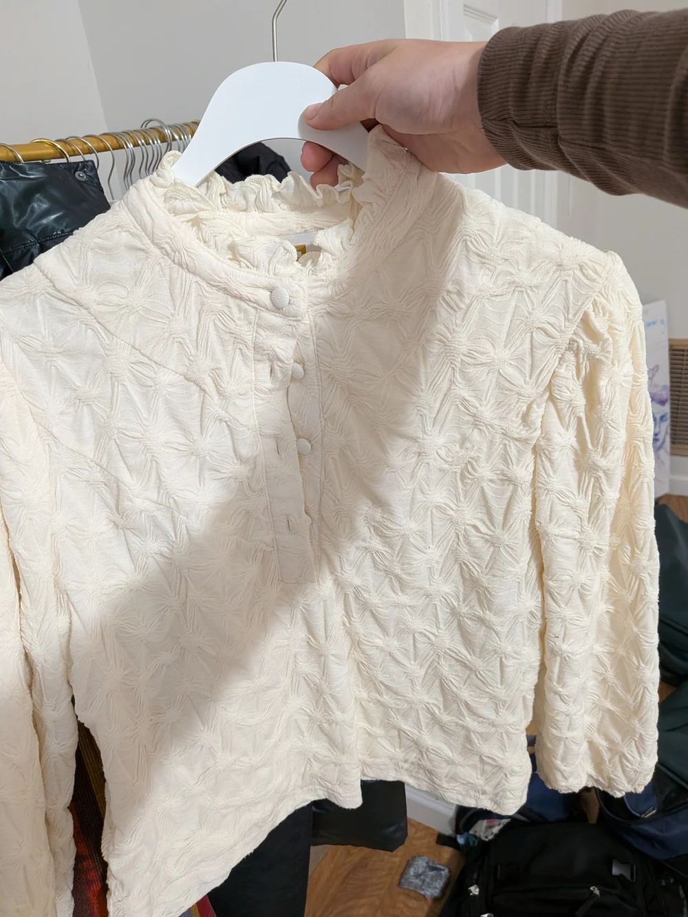 Cream textured blouse with a subtle floral embossed pattern. Features a ruffle mock neck and fabric-covered button placket. Lightweight and feminine silhouette. Perfect for layering or dressed-up looks.