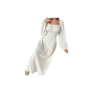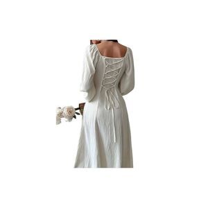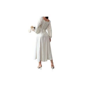 Textured Cross Tie Lantern Sleeve Dress, Elegant Square Neck white Solid Color s
