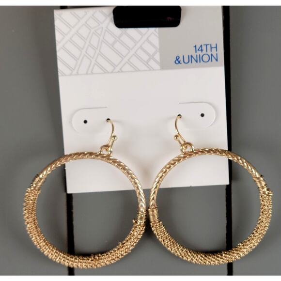 14th & Union gold tone large hoop earrings featuring a textured rope and mesh design. Lightweight with fish hook backs. Originally sold at Nordstrom Rack.
